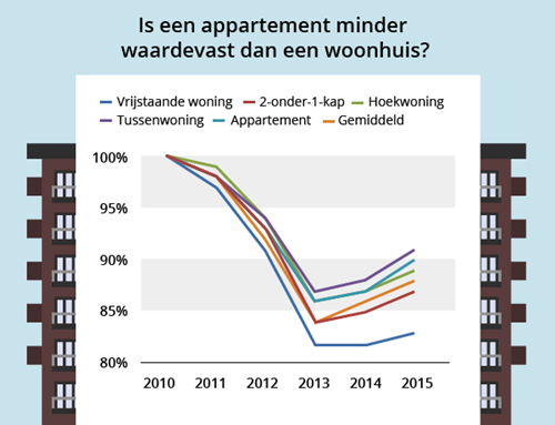 Het doemscenario kwam niet uit. Gelukkig. Appartementen daalden de laatste jaren wel in waarde, maar niet veel meer dan andere woningtypen. Appartementen, hoekhuizen en tussenwoningen bleken ongeveer even waardevast, zo blijkt uit gegevens van het Kadaster.
