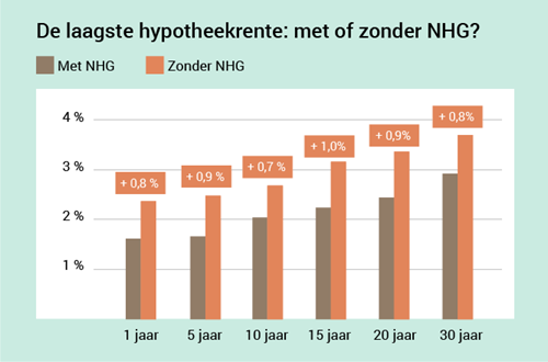 Voor een annuïteitenhypotheek mét NHG van € 230.000 betaal je verspreid over dertig jaar € 295.930 aan aflossing en rente. Zonder NHG kom je bijna € 15.000 hoger uit, op € 310.794.