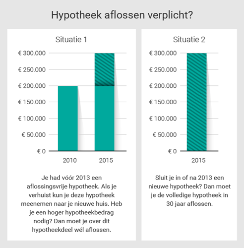 Bij nieuwe hypotheken, afgesloten na 1 januari 2013, is aflossen wél verplicht. Die regel geldt ook als je je bestaande hypotheek wilt verhogen. Stel, je hebt een bestaande aflossingsvrije hypotheek van € 200.000. Je verhuist naar een duurder huis, en hebt hiervoor € 100.000 extra hypotheek nodig. De aflossingsvrije hypotheek van € 200.000 kun je meenemen, voor die extra € 100.000 sluit je een nieuw hypotheekdeel af. Bijvoorbeeld een annuïtaire of lineaire hypotheek, zodat je óók over dat deel van je hypotheek recht blijft houden op hypotheekrenteaftrek.