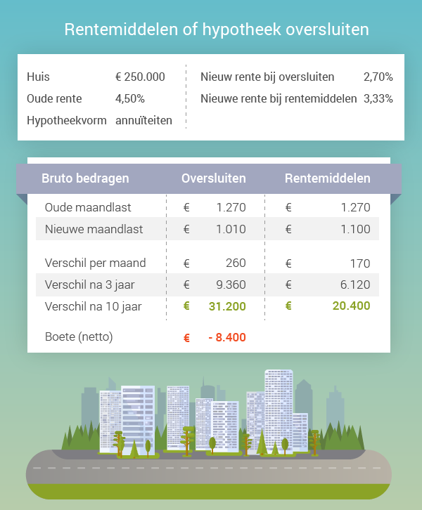 Bij rentemiddelen blijf je bij je huidige bank en profiteer je toch van de lage rente. De bank ‘middelt’ als het ware tussen de rente die je nu betaalt en de actuele hypotheekrente. De boete die je bij hypotheek oversluiten betaalt, wordt bij rentemiddeling uitgesmeerd over de resterende jaren. Een uitgebreide uitleg over rentemiddeling vind je in het artikel “Rentemiddeling: hoe werkt het?