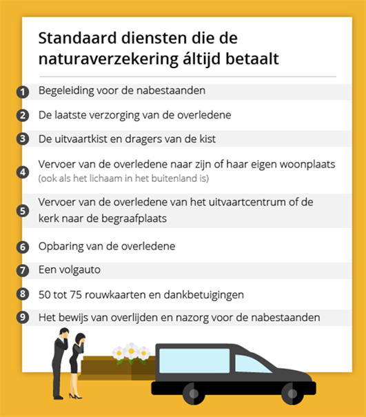 Sommige verzekeraars bieden overigens ook een combinatie van een natura- en kapitaalverzekering aan. Je sluit dan bijvoorbeeld een dienstenpakket ter waarde van € 4.500 voor de hoofdzaken (de locatie, de kist, de rouwauto en een volgauto) en daarnaast geldt een vrij te besteden bedrag van bijvoorbeeld € 3.000 of € 5.000. Voor dat bedrag kunnen dan persoonlijke wensen en aankleding geregeld worden, naar inzicht van de nabestaanden.