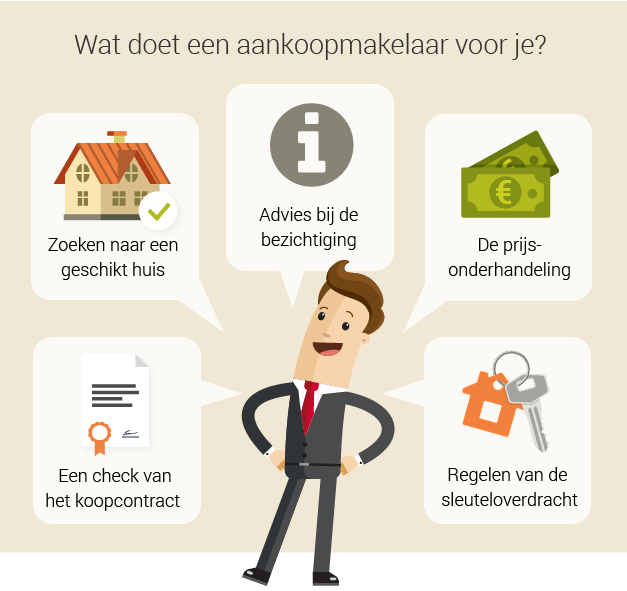 Denk je erover een aankoopmakelaar in te schakelen? Vraag meerdere offertes op en controleer de voorwaarden. Zoals wat wel en niet in de prijs inbegrepen is. Denk aan btw-kosten (21%), een voorlopige waardebepaling, bezichtiging met bouwkundig expert en taxatiekosten.