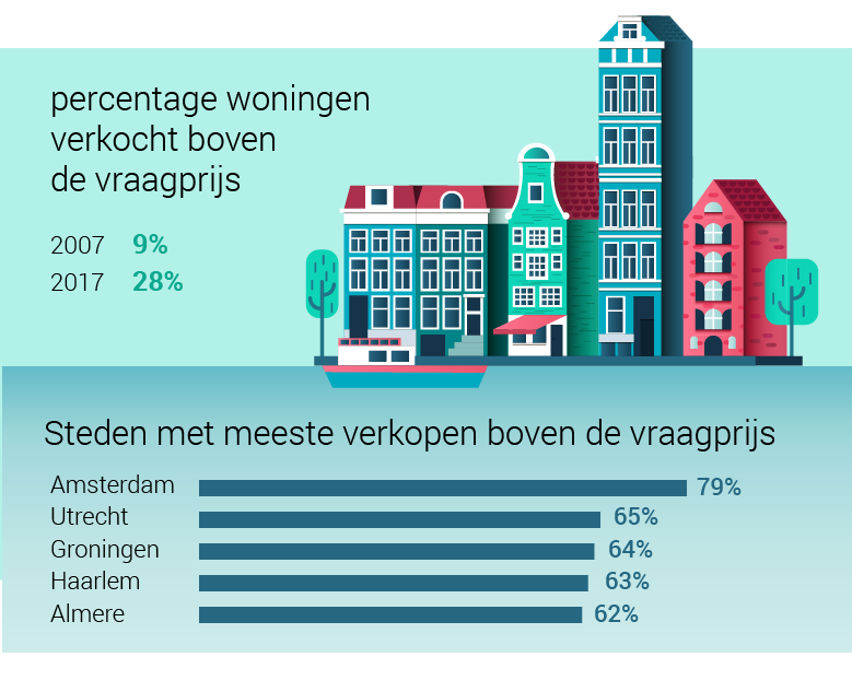 In het tweede kwartaal van 2017 ging 28 procent van de verkochte woningen weg boven de vraagprijs. Niet eerder in de laatste vijftien jaar gingen zoveel kopers tot het uiterste om een woning te bemachtigen. Zelfs niet in 2007, de laatste keer dat de woningmarkt een piek beleefde.