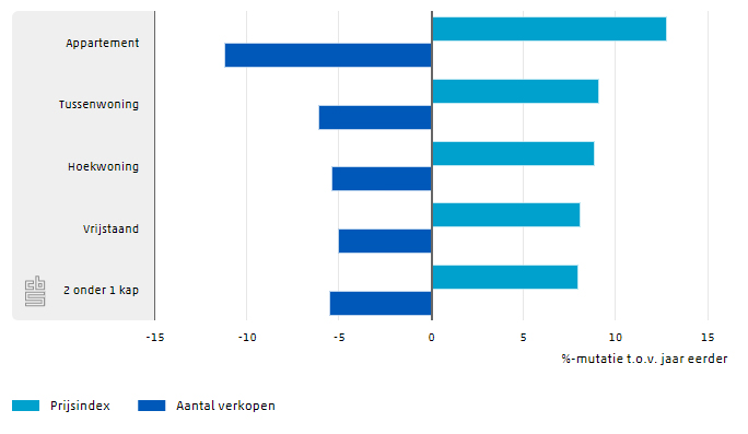 Van alle woningtypes zijn appartementen het sterkst (+12,8%) in prijs gestegen. Ook hier is het verband tussen het aantal verkopen en de prijs merkbaar. Het aantal verkochte appartementen nam het sterkst af. Niet omdat er geen kopers voor zijn maar vanwege het gebrek aan aanbod. De gemiddelde prijsstijging was procentueel gezien het kleinst bij vrijstaande woningen. Dat wil niet zeggen dat vrijstaand wonen goedkoop is, de gemiddelde koopsom bedroeg 426.211 in het afgelopen kwartaal.