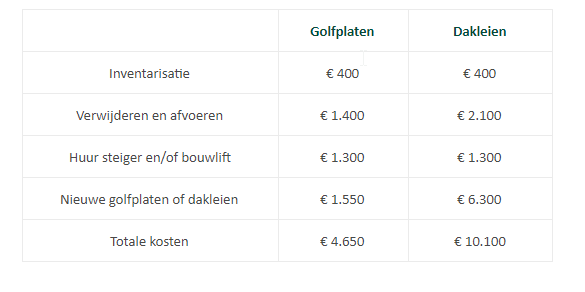 Als woningeigenaar ben je zelf verantwoordelijk voor je huis. Je draait daarom zelf op voor de kosten om asbest(dak) te verwijderen. Grote oppervlakten asbest moeten worden verwijderd door een gecertificeerd bedrijf, zodat het wordt behandeld en afgevoerd volgens de wettelijke eisen. Milieu centraal geeft volgend voorbeeld voor de kosten van het verwijderen van een asbestdak met een oppervlakte van 50m2.