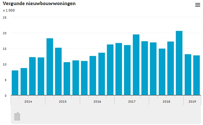 In het tweede kwartaal van 2019 werd voor 12,8 duizend nieuwbouwwoningen een vergunning verleend. Het aantal ligt ruim 14 procent lager dan in hetzelfde kwartaal vorig jaar en staat op de laagste stand in drie jaar. De daling is een indicatie voor de aanwas van woningen in de komende jaren. Het streven van de overheid is maar liefst 75.000 woningen per jaar. Een weinig realistische ambitie gezien de situatie in de praktijk.