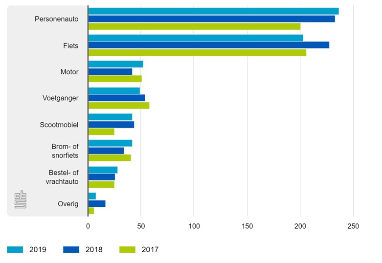 De meeste verkeersslachtoffers waren inzittenden van een personenauto (237); 168 bestuurders en 69 passagiers. Daarnaast overleden onder andere 203 fietsers, 52 motorrijders, 49 voetgangers, 42 bestuurders van een scootmobiel en 42 brom- en snorfietsers.