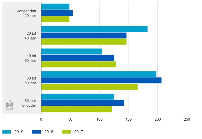 De helft van het aantal verkeersdoden was 60 jaar of ouder. Het aantal verkeersdoden in deze leeftijdsgroep nam wel af van 350 in 2018 naar 324 in 2019. In 2018 nam het aantal in deze leeftijdsgroep nog toe met 62. Oudere dodelijke verkeersslachtoffers (60-plus) hebben relatief vaak een fietsongeval, terwijl verkeersslachtoffers jonger dan 60 jaar voornamelijk omkomen bij een auto-ongeluk.