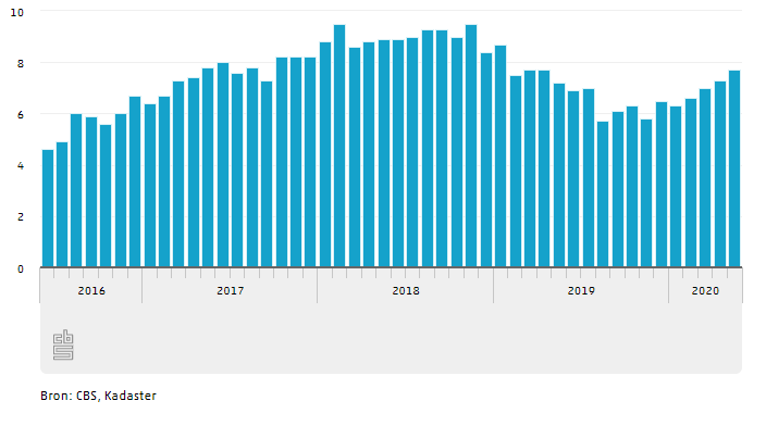 Kocht je afgelopen mei een bestaande koopwoning, dan betaalde je gemiddeld 7,7 procent meer dan in dezelfde maand vorig jaar. De prijs is hiermee meer gestegen dan in voorgaande maanden van dit jaar. Kanttekening is dat de cijfers van het CBS en het Kadaster gebaseerd zijn op de overdracht bij de notaris. Hierdoor is een eventuele invloed van het coronavirus nog beperkt zichtbaar. Tegenover de prijsstijging is in mei wel een daling van het aantal verkopen merkbaar.