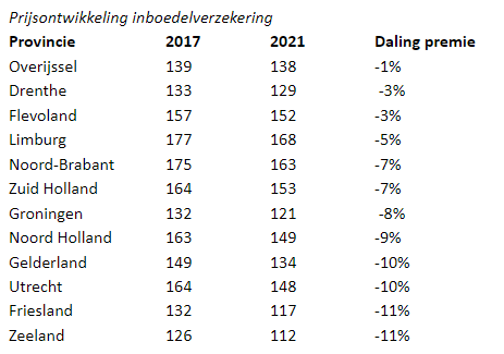 De premiedaling van de inboedelverzekering verschilt per provincie, zo onderzocht MoneyView. Alleen in de provincie Overijssel is een inboedelverzekering weinig voordeliger dan in 2017. Koplopers zijn de provincies Friesland en Zeeland, met prijsdalingen van 10% en meer.