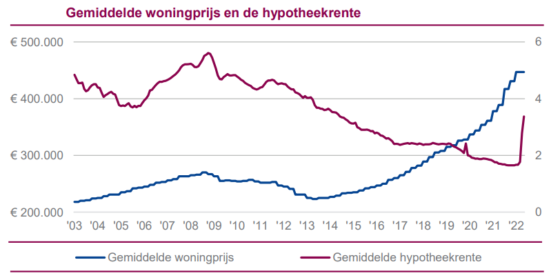 In de periode tussen 2013 en 2017 daalde de hypotheekrente, terwijl de woningprijs in de lift zat. Deze tegengesteld beweging zorgde voor gelijkblijvende bruto maandlasten van een annuïtaire hypotheek. Na die periode daalde de hypotheekrente minder sterk en werd de stijging van de gemiddelde woningprijs niet meer gecompenseerd. Eind 2017 lagen de bruto maandlasten bij een annuïtaire lening net onder de € 1.100 euro. In 2020 was het € 1.300 euro en eind vorig jaar € 1.500 euro. De recente stevige rentestijging heeft dit in een stroomversnelling gebracht, met een gemiddeld bruto maandlast van bijna € 2.000.