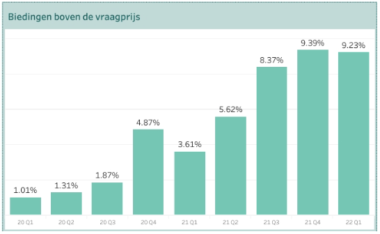 Waar begin 2020 gemiddeld nog maar 1,01 procent boven de vraagprijs werd geboden, was dat in het laatste kwartaal van 2021 opgelopen naar 9,39 procent. In het eerste kwartaal van dit jaar is het percentage licht gedaald (- 0,16). Dit blijkt uit onderzoek van dataspecialist Matrixian Group.