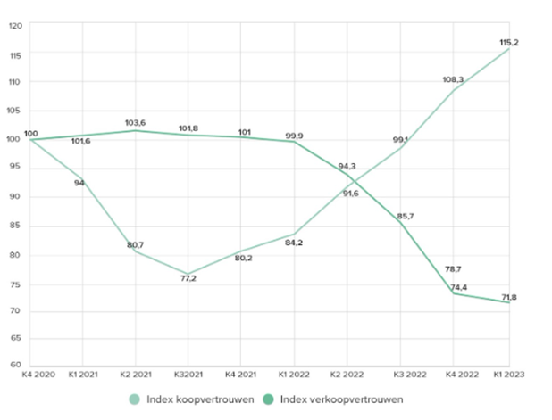 In de laatste kwartalen van 2022 kozen steeds minder mensen om eerst te kopen en dan te verkopen (verkopersmarkt). Maar in het eerste kwartaal van 2023 nam dit weer licht toe, van 12% naar 15%. Het sentiment om eerst te verkopen en dan pas te verkopen nam in het eerste kwartaal van 2023 af, in tegenstelling tot voorgaande kwartalen.