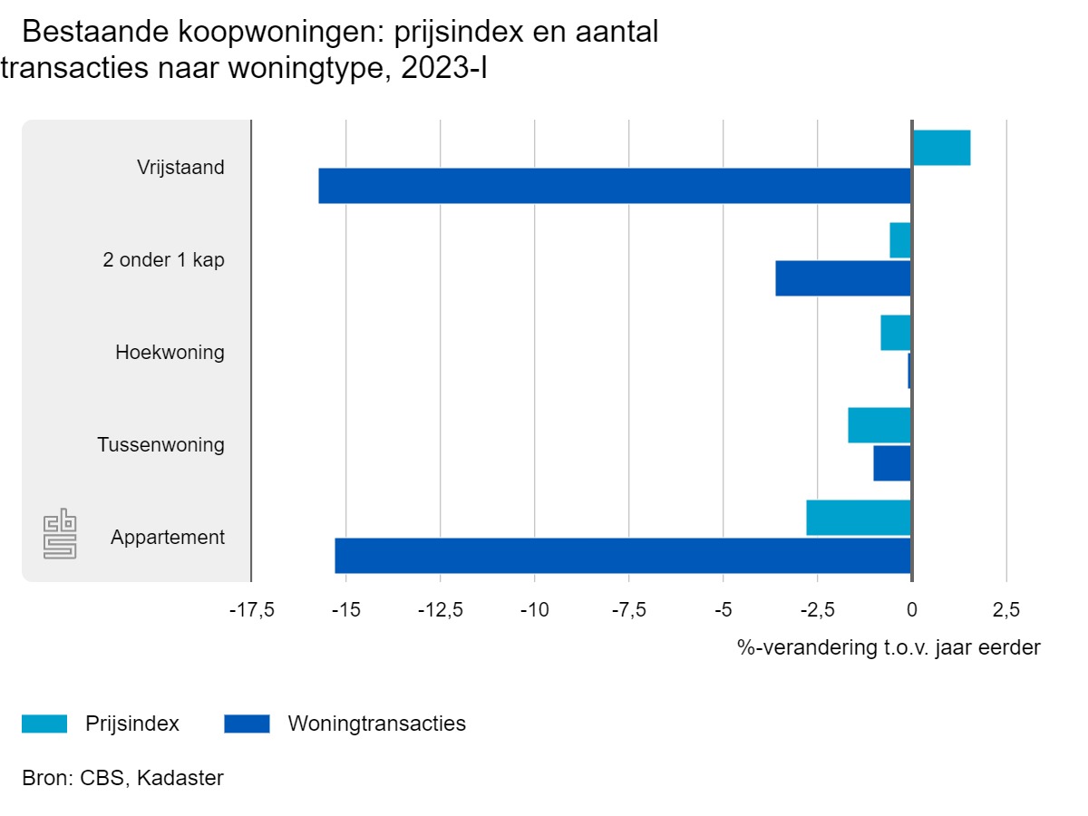 Het CBS heeft bij de woningmarktontwikkelingen ook het type woning onder de loep genomen. Bij vrijwel alle woningtype daalden de prijzen. Alleen vrijstaande woningen zijn duurder geworden (+1,6%). De prijzen van appartementen zijn het meest gedaald. Bij alle woningtypes zijn in het eerste kwartaal minder woningen verkocht ten opzichte van een jaar eerder. Vooral vrijstaande woningen en appartementen zijn minder in trek.